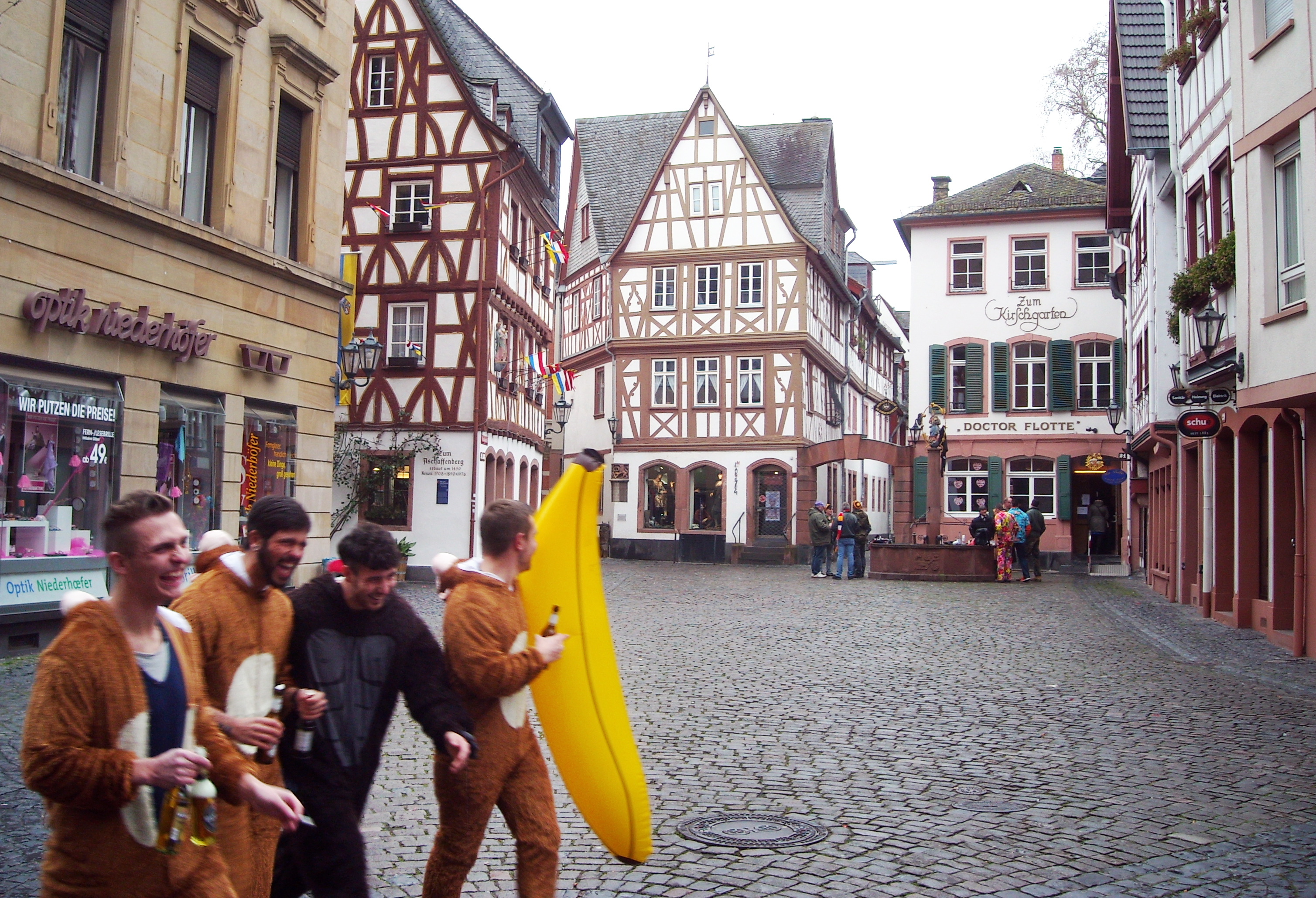 Jag skulle fota fina tyska korsvirkeshus i Mainz och mitt i klicket kommer banan med tillhörande apor (björnar?) vandrandes in i min seriöst uppstyrda arkitekturbild. Men så säger ju den här bilden i slutänden så mycket mer om Mainz och den stora karnevalen som pågick i staden just nu, än några bjälkar i kors från urminnes tider. Helau!